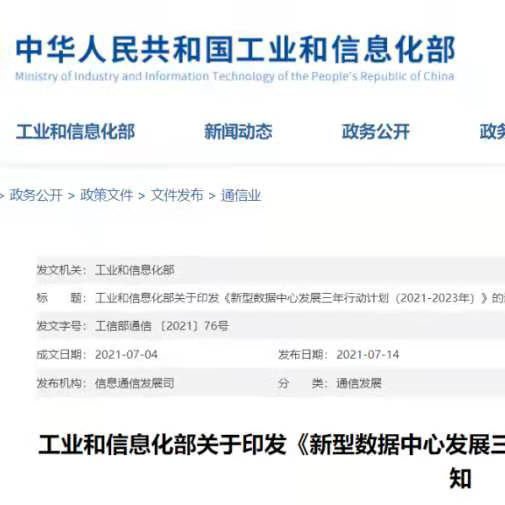 工信部于7月14日印发了《新型数据中心发展三年行动计划(2021-2023年)》,明确提出要用3年时间,基本形成布局合理、技术先进、绿色低碳、算力规模与数字经济增长相适应的新型数据中心发展格局。